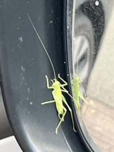En bijzonder: op de terugweg zag ik dat een jonge krekel met ons mee liftte, zich stevig vastklemmend aan mijn achteruitkijkspiegel; een echte avonturier!